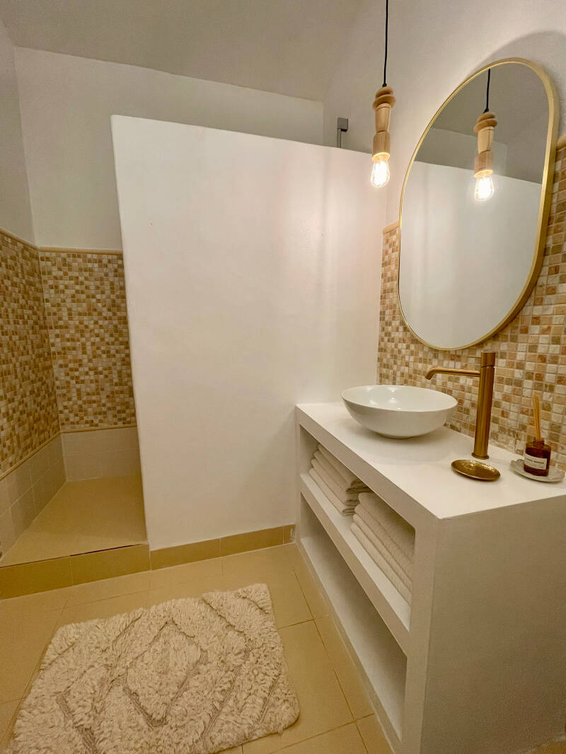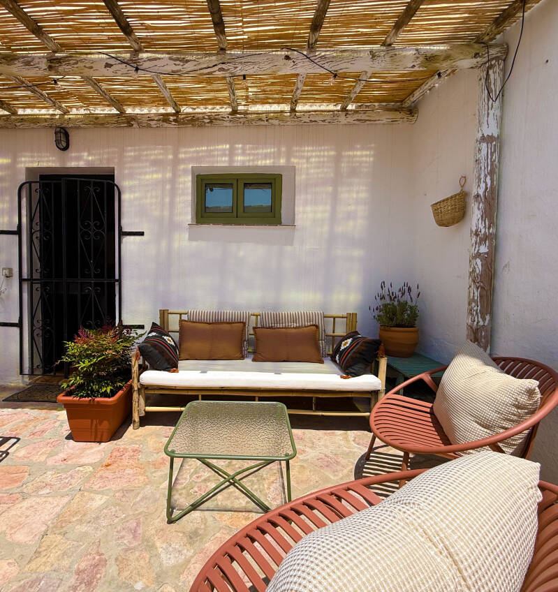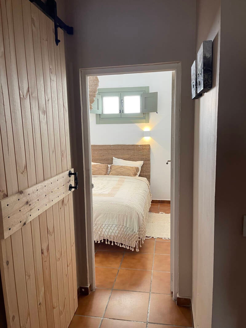 Upon entering through the characteristic Spanish door, you step into a large, spacious living room. It offers a comfortable sitting area, where you can relax, while the large dining table for six invites for convivial meals. The open-plan kitchen, fully equipped and modern, flows seamlessly into the sunny, walled patio with outdoor shower and herb garden – an ideal place to enjoy outdoor living in peace and privacy. From the living room, you have access to a cozy bedroom with a double bed, with an adjoining small bathroom for extra convenience.